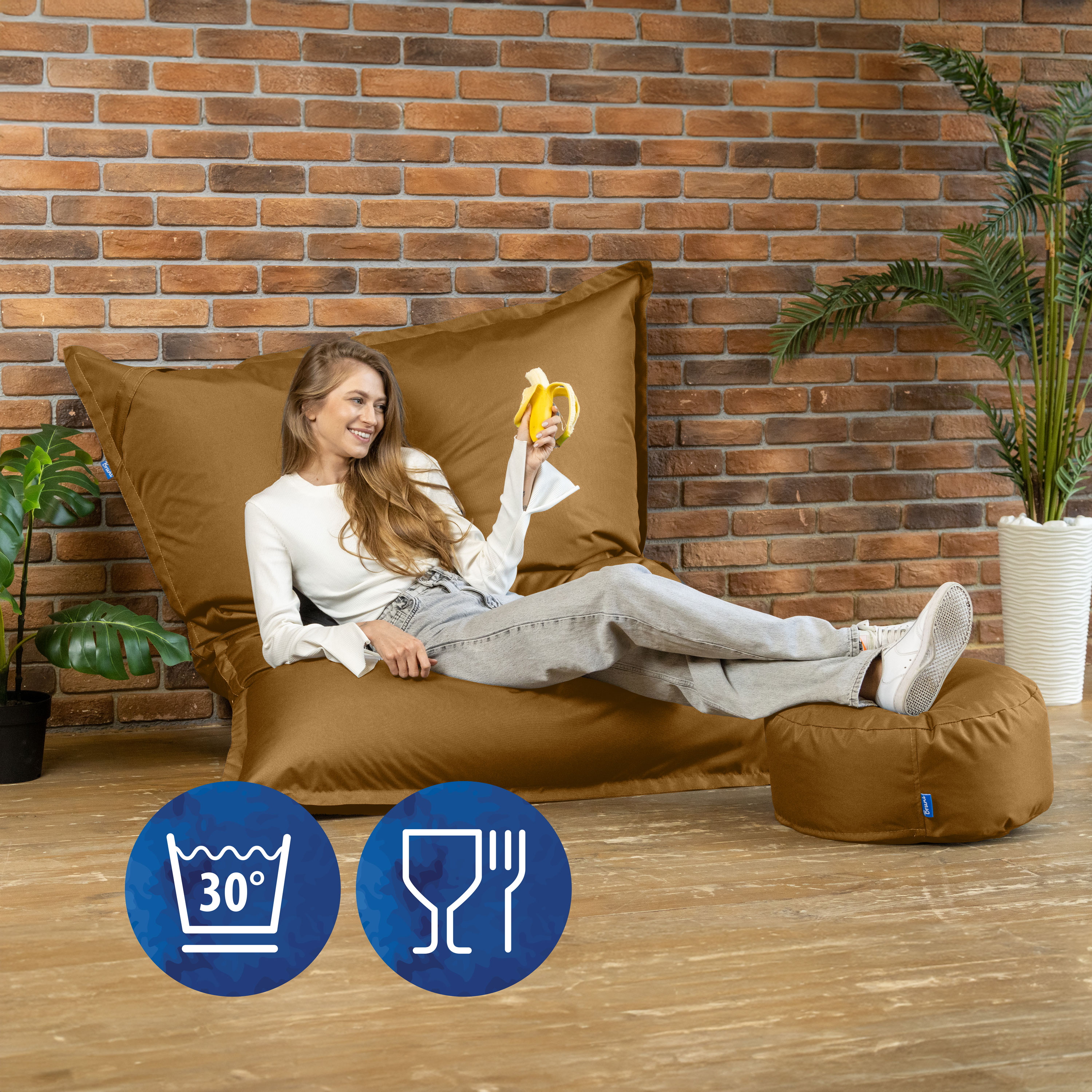 Eigenschaften "Bruni Caree XXL-Sitzsack in Hellbraun - rechteckiger Indoor- und Outdoor-Sitzsack mit 140x180 cm aus Deutschland"