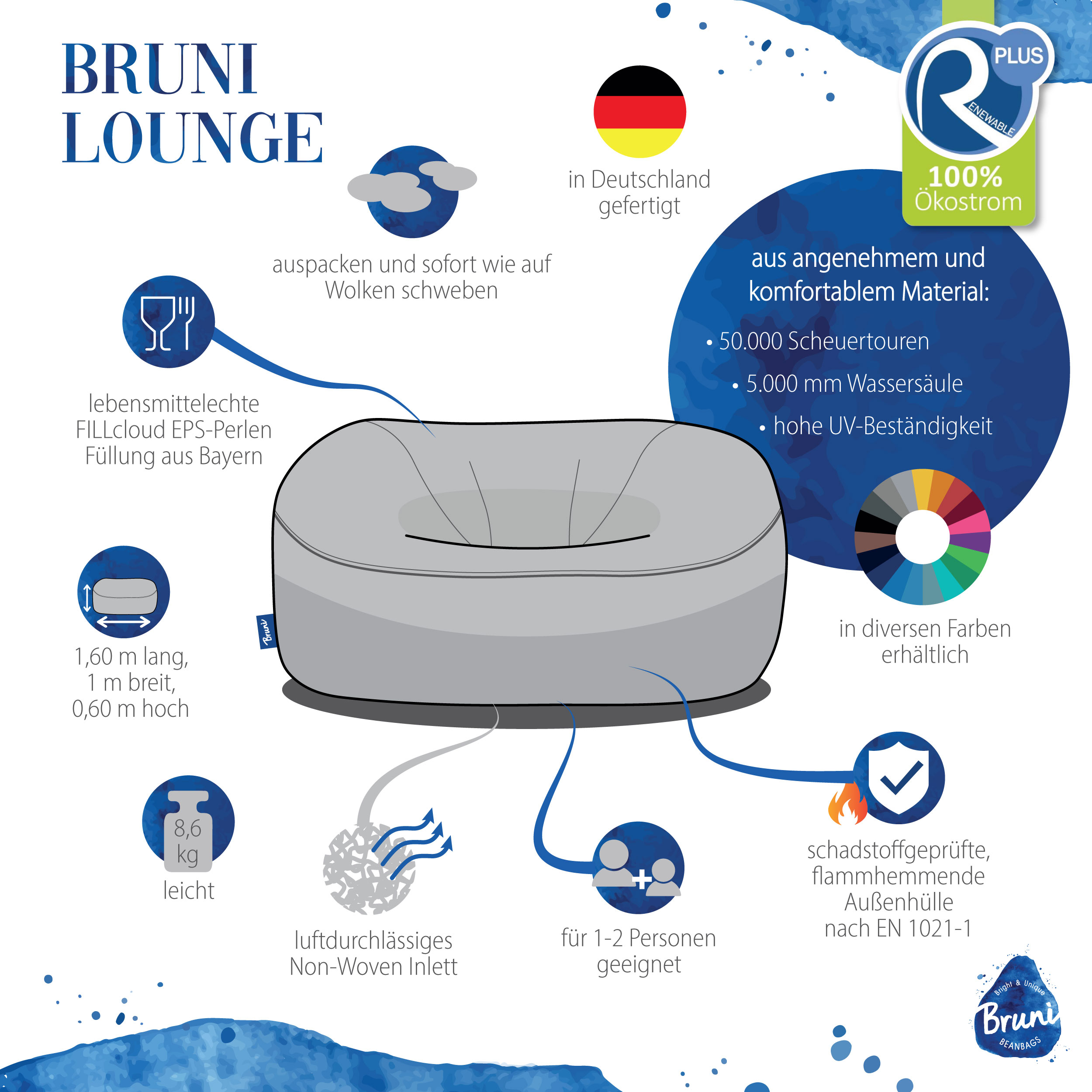 Das Sitzsack-Sofa Bruni Lounge ist vielseitig einsetzbar. Hierzu trägt auch das so robuste wie komfortable Außenmaterial bei. Dank mehr als 50.000 Scheuertouren und einer hochwertigen PU-Beschichtung ist das widerstandsfähige Sofa besonders langlebig. Zudem glänzt die Außenhülle von diesem XXL-Sitzsack mit einer Wassersäule von 5.000 mm und einer UV-Beständigkeit von 4–5/5. Dadurch gilt das Material der Außenhülle unseres Sitzsack-Sofas als wasserfest (nicht jedoch die Reißverschlüsse, weshalb wir nicht empfehlen, die Bruni Lounge im Regen stehen zu lassen) und hält besonders lange seine kräftige Farbe. Auch beim Thema Brandschutz überzeugt die Bruni Lounge: Der Bezug ist flammhemmend nach EN1021-1 geprüft – ideal für Haushalte mit Kindern, öffentliche Bereiche oder einfach für alle, die Wert auf zusätzliche Sicherheit legen. Auch wenn du einmal ein Glas Wein über deine Bruni Lounge verschüttest, ist das für die 1–2 Personen-Couch kein Problem! Leichte Verschmutzungen können ganz einfach mit einem feuchten Tuch abgewischt werden.